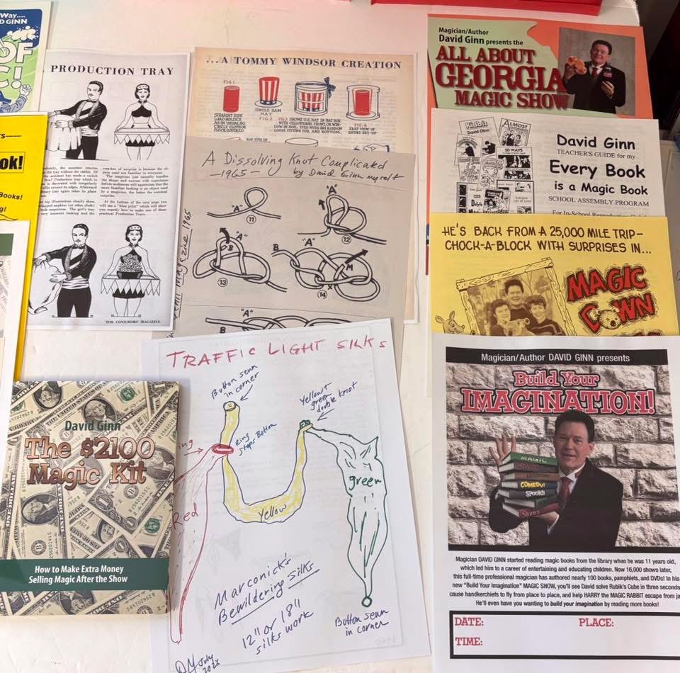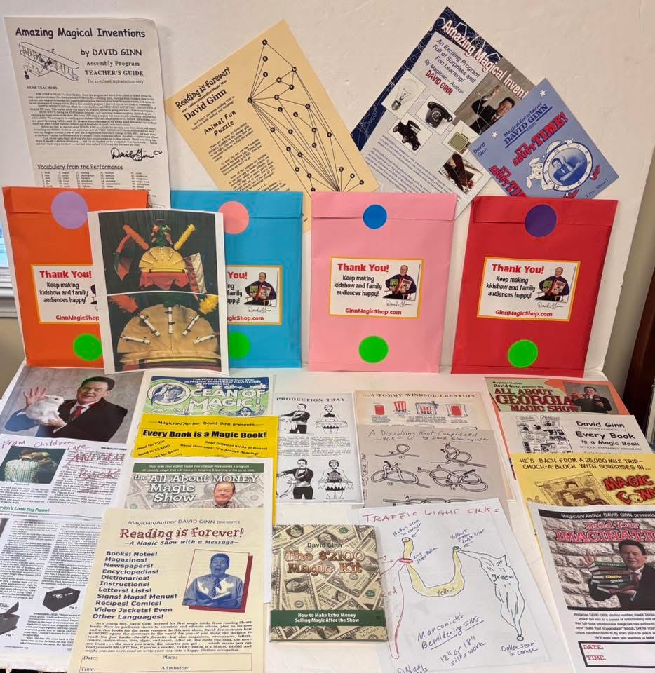 The Kidabra Lecture Kit is a package of some 40 items — five show posters, 2 teacher guides, a kid show activity page, my reminder postcard, 3 do it yourself tricks explained, my dissolving rope (from the lecture) and how to tie it, my Super Plumes set up (photos of it), Marconick’s 1960 trick BEWILDERING SILKS with original instructions & my drawings, my JAPANESE HANK BOX KIDSHOW ROUTINE EXPLAINED, an 8 x 10 Ginn photo with Harry the Rabbit, and my $2100 MAGIC KIT DVD (a $20 value alone) teaching you Back of Room Sales plus seven easy MONEY tricks explained.
